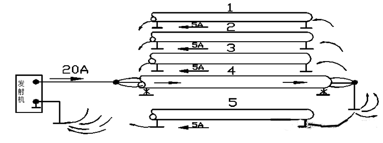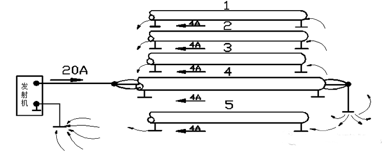 由于電纜屏蔽層通常與地相連,如果電纜束中,其它電纜也接到公共地上,發生器上黑色輸出插孔可連到公共地上,返回電流在幾根電纜屏蔽層進行分配,將返回電流分成許多支流,意味著被識別電纜的差值電流較大,有用信號較清楚,“差值”的意思是輸出電流和其分得的返回電流在同一通道內。如圖4所示,圖4中有5根電纜,4號電纜是我們需要識別的,要識別的電纜中“輸出電流”為20A。假設返回電流在所有電纜的屏蔽層中平均分配,在要測的電纜中應有4A的返回電流,要識別的電纜中的差值為:20A(輸出)-4A(返回)=16A(差值)