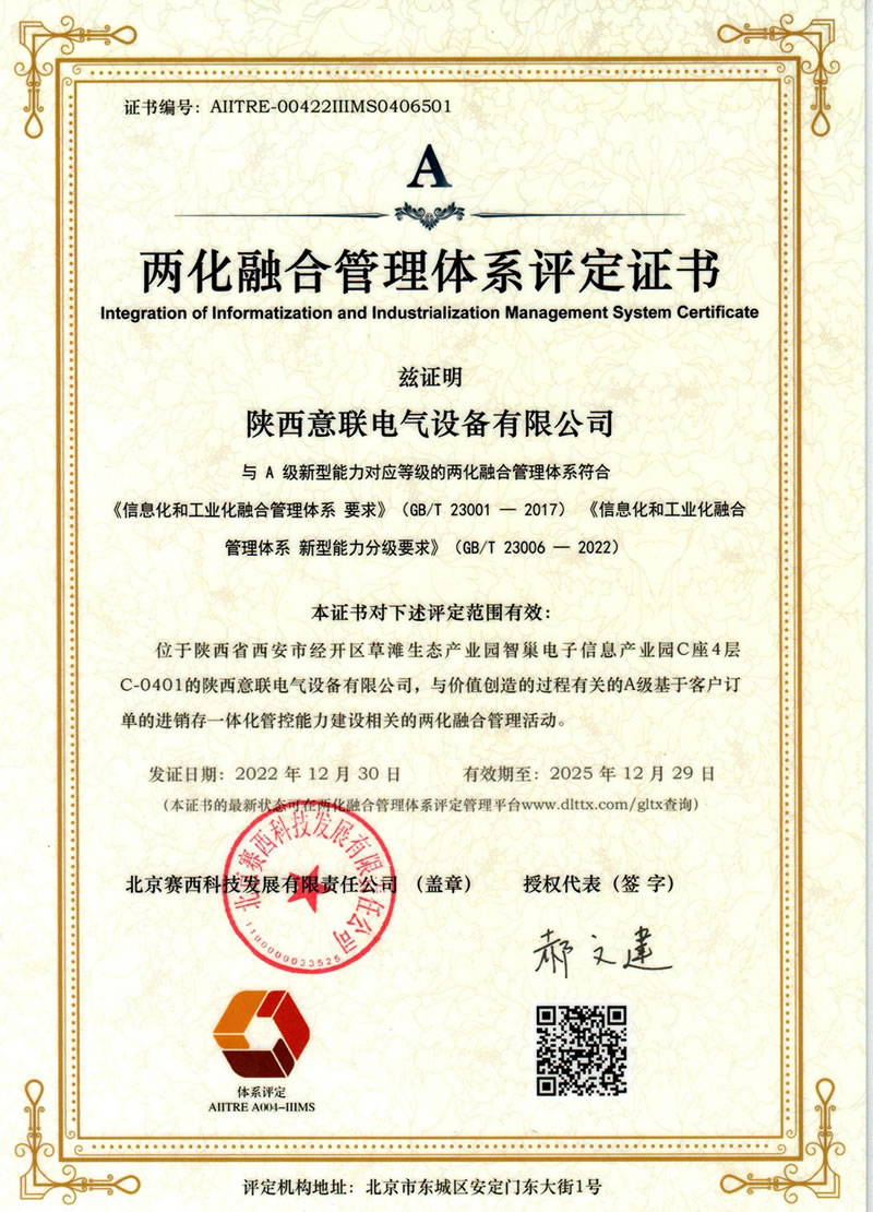 近日,陜西意聯電氣有限公司收到兩化融合管理體系評定證書,正式通過國家兩化融合管理體系貫標認證。此前,公司積極響應政府推進信息化與工業化融合的倡導,開展與價值創造的過程有關的A級基于客戶訂單的進銷存一體化管控能力的打造,建設兩化融合管理體系,助推公司數字化轉型發展。